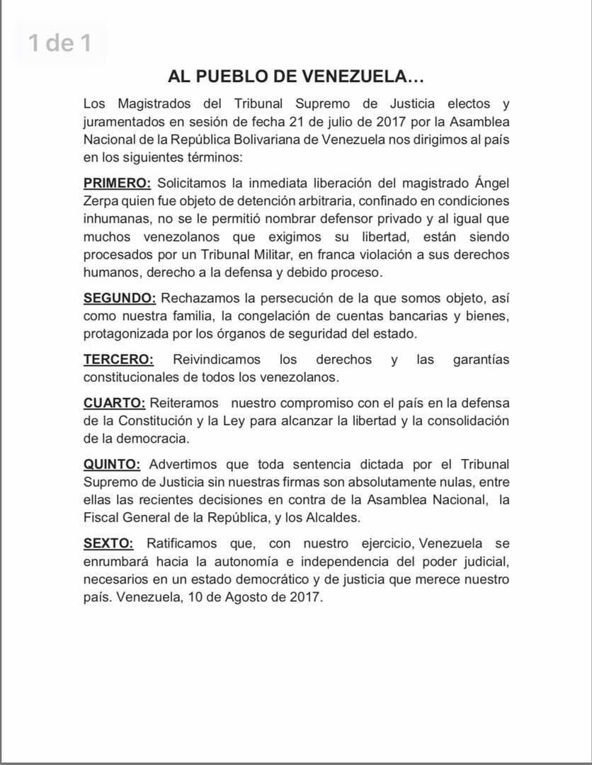 Los magistrados del Tribunal Supremo de Justicia juramentados por la Asamblea Nacional emitieron un comunicado en el que se dirige al país para exigir la inmediata liberación del magistrado Ángel Zerpa, rechazar la persecución a los jueces y congelaciones de sus bienes, además de «reivindicar los derechos y garantías constitucionales de los venezolanos».